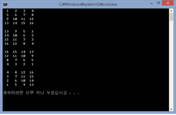 아마 열혈C 도전 문제였던 걸로 기억하는데 문제 내용은 별거 아니었다. 그냥 아래처럼 4x4 배열을 시계방향으로 90도씩 회전시켜서 출력하는 것.
