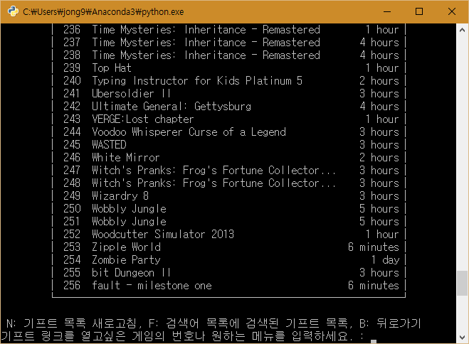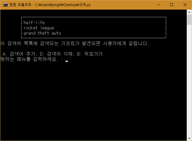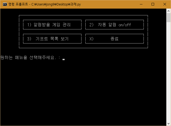 그리 대단한 코드는 아니고 그냥 스팀 기프트 홈페이지를 파싱해서 등록된 게임이 있으면 메시지 창을 띄워 알려주는 게 끝이다. 주기적으로 알려주는 부분은 윈도우 작업 스케줄러에 등록해서 해결하고 gui는 개나 줘 버린 바람에 주기적으로 실행될 때마다 거슬리는 프롬프트 창을 띄운다. 그래서 게임할 때마다 거슬림...