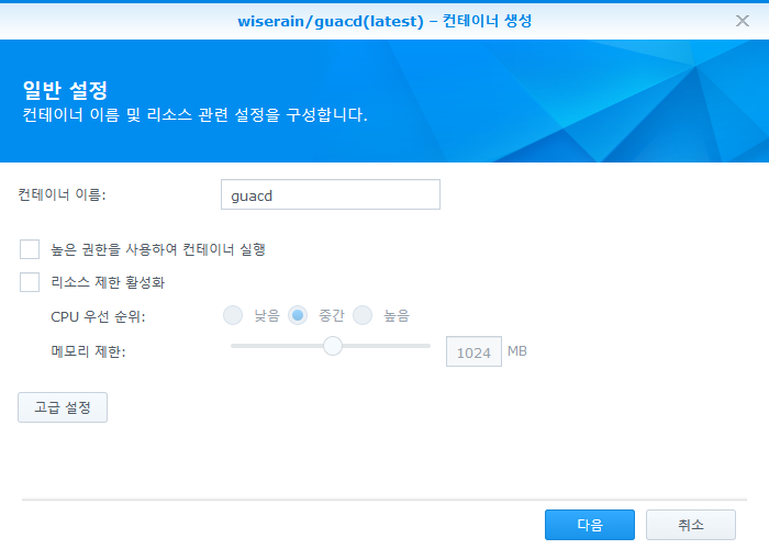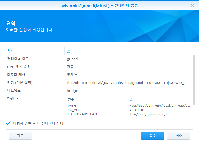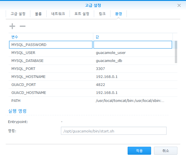 MYSQL_HOSTNAME - <nas 주소, 보통 내부ip를 입력하는데 꿀팁으로 도커 bridge 네트워크의 게이트웨이 주소(172.17.0.1)를 입력하면 내부ip가 바뀌어도 바꿔줄 필요가 없어진다. 아니면 바뀔 일 없는 외부 주소를 입력하거나...>MYSQL_PORT - <MariaDB 포트>MYSQL_DATABASE - guacamole_dbMYSQL_USER - guacamole_userMYSQL_PASSWORD - <좀 전에 만든 DB유저 패스워드>
