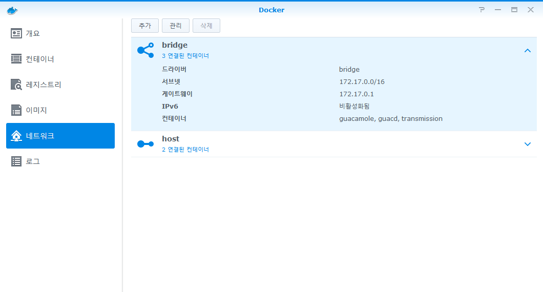 3. 그리고 네트워크 메뉴에서 bridge 네트워크의 아이피 대역을 확인한다. 데이터베이스에 접근할 아이피를 설정하는 데 필요하다.