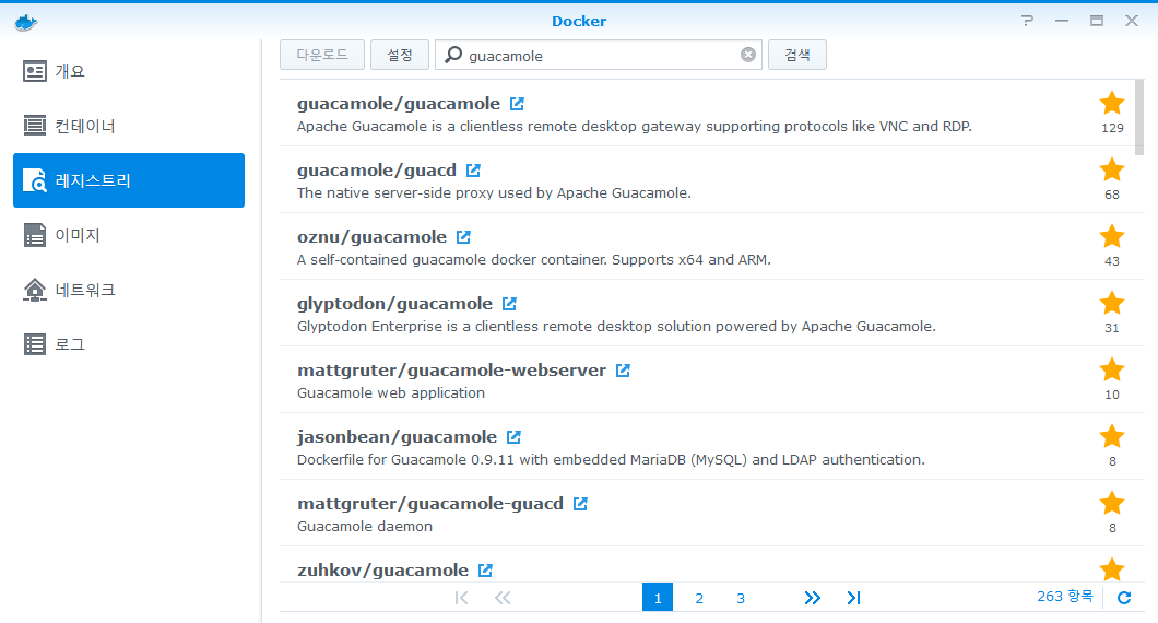 2. Docker를 열고 guacamole/guacamole와 wiserain/guacd 이미지를 다운받는다.