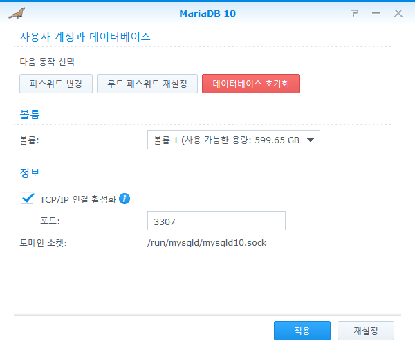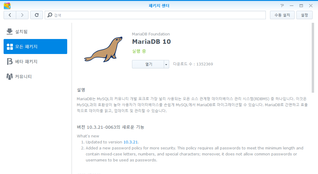 mysql or postgresql - 각종 설정을 저장할 데이터베이스이다. 근데 굳이 도커로 설치하지 않고 시놀로지에서 패키지로 제공하는 MariaDB를 사용하기로 했다.