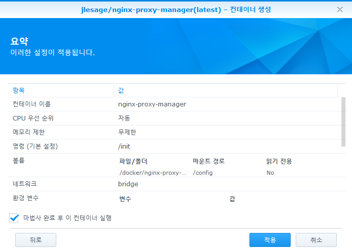 원래는 jc21/nginx-proxy-manager가 원조 이미지인데 얘는 db를 따로 설치해야 한다. 뭐 저번에 설치한 MariaDB를 써도 되겠지만 이번엔 npm과 db를 묶은 올인원 이미지인 jlesage/nginx-proxy-manager를 사용하기로 했다.