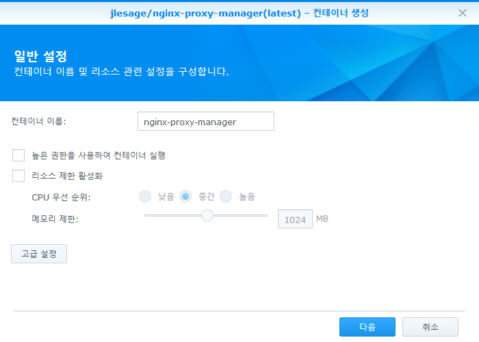 3. 다운받은 jlesage/nginx-proxy-manager 이미지를 선택해서 컨테이너 생성을 시작한다.