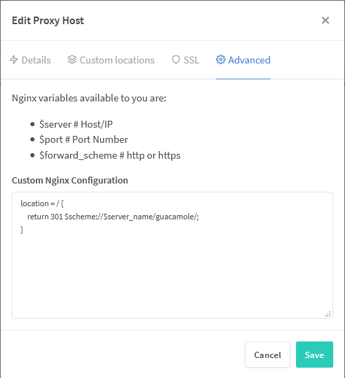 간단히 설명하자면 루트 도메인으로 접속 시 /guacamole/로 리다이렉션 해버리라는 설정이다.