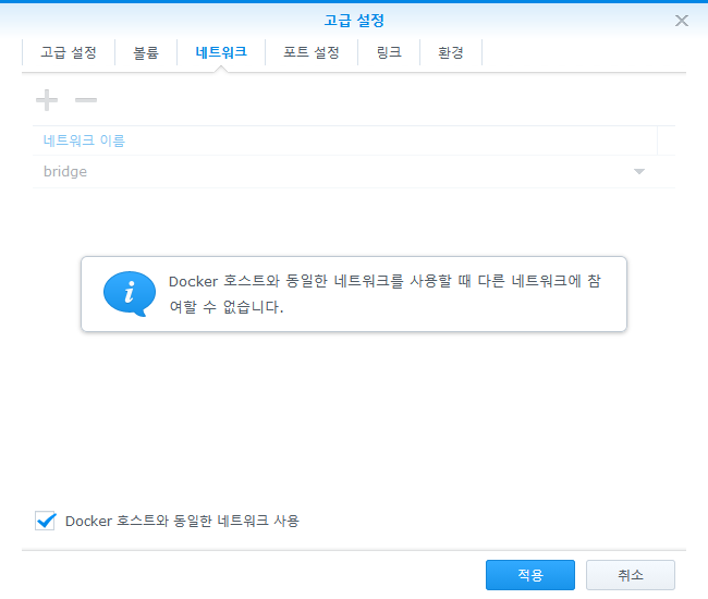 6. 네트워크 탭에서 Docker 호스트와 동일한 네트워크 사용에 체크해준다.