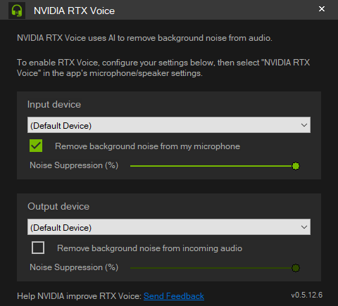 설치 완료 후 실행하면 이렇게 설정할 수 있다. 노이즈 캔슬링할 마이크를 선택하고 "Remove background noise from my microphone"를 키면 주변 소음이 사라진다.