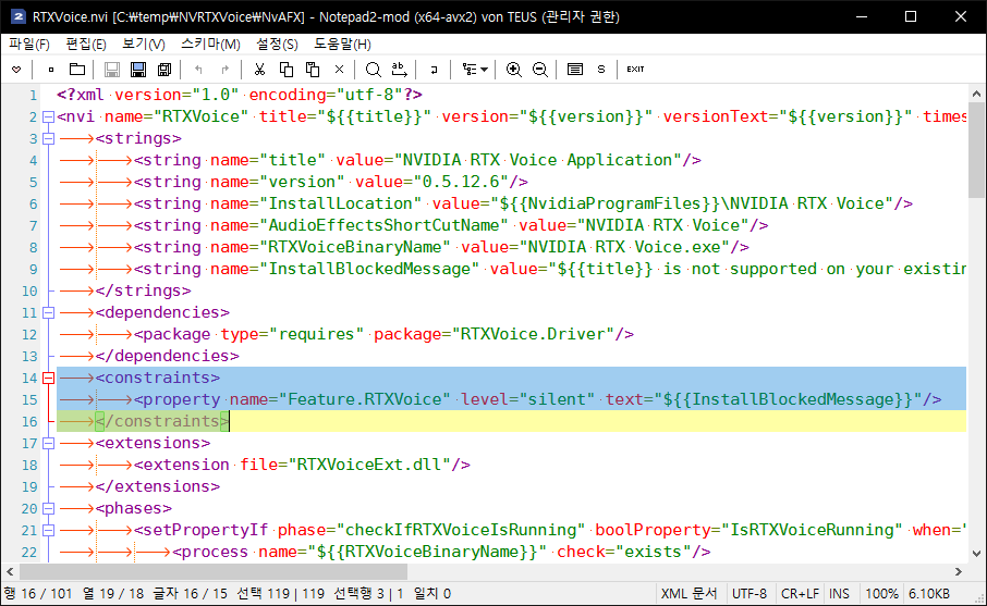 "C:\temp\NVRTXVoice\NvAFX\RTXVoice.nvi" 파일을 열어서 해당 부분을 삭제하고 저장한다. 관리자 권한이 필요하다.