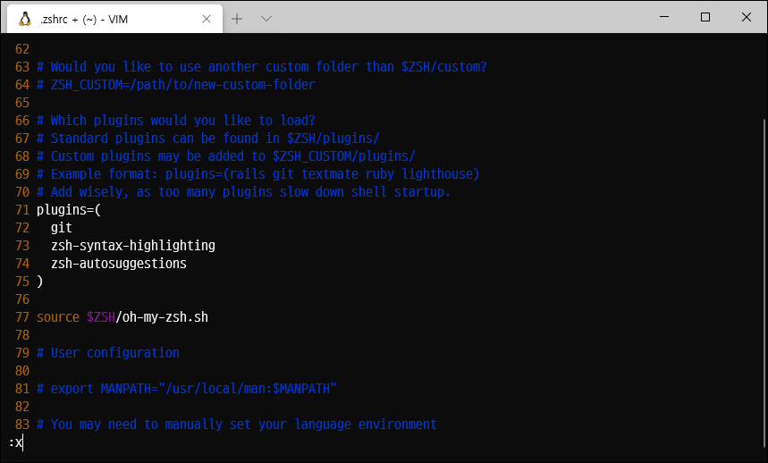 plugins 변수에 다운로드한 플러그인을 추가한다. zsh-syntax-highlighting zsh-autosuggestions