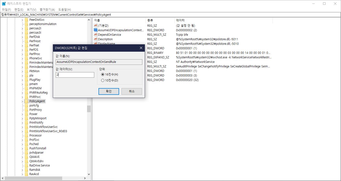 레지스트리 편집기(regedit)를 열고 HKEY_LOCAL_MACHINE\SYSTEM\CurrentControlSet\Services\PolicyAgent 키로 이동한다. 우클릭 메뉴에서 "새로 만들기 → DWORD(32비트) 값"을 선택하고 이름을 AssumeUDPEncapsulationContextOnSendRule로 만든다.(대소문자 중요!) 만든 걸 더블클릭해서 데이터를 2로 설정한 뒤 재부팅을 하면 끝!