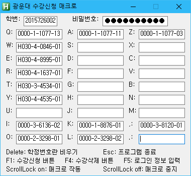 패시브 기능인 메시지박스 자동 제거 때문에 수강삭제 버튼 클릭 시 묻지도 따지지도 않고 과목이 삭제되니 주의!Scrolllock- 매크로 단축키 사용/중지