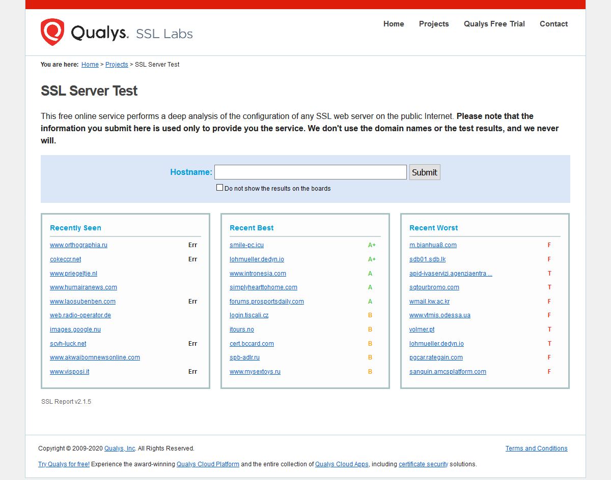 SSL Server Test This free online service performs a deep analysis of the configuration of any SSL web server on the public Internet. Please note that the information you submit here is used only to provide you the service. We don't use the domain names or