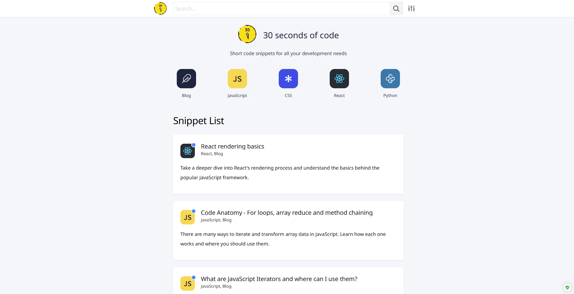 Browse 1041 short code snippets for all your development needs on 30 seconds of code.