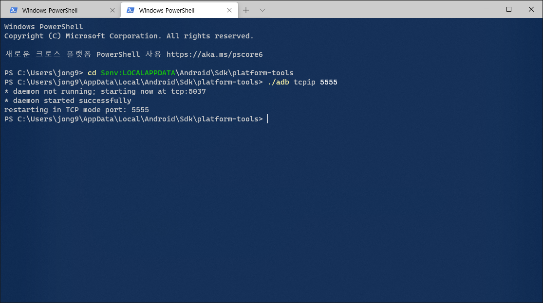 3. 터미널을 열어 adb가 있는 폴더로 이동한다. 안드로이드 스튜디오 설치 시에 별도로 sdk 경로를 바꾸지 않았다면 경로는 %LOCALAPPDATA%\Android\Sdk\platform-tools