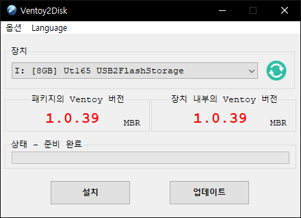 벤토이 홈페이지에서 벤토이를 받아 실행하고 부팅디스크로 만들 usb 메모리를 선택한 뒤 설치를 누르면 준비는 끝난다.