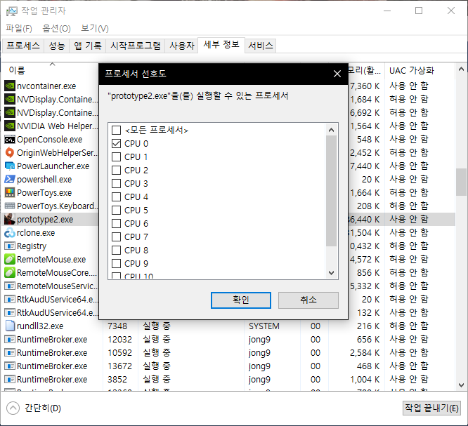 마우스 우클릭 후 선호도 설정에 들어가 모든 프로세서를 체크 해제하고 CPU 0만 체크한 뒤 확인을 누른다.