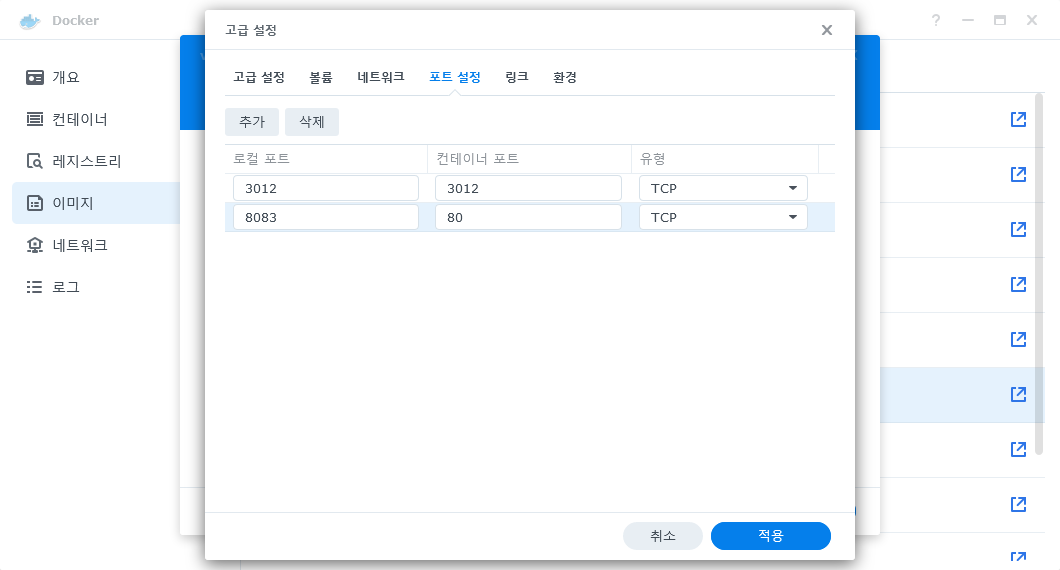 5. 포트 설정 탭에서 적당한 포트를 매핑해준다. 80이 웹페이지 포트고 3012는 웹소켓 포트이다. 나는 80 포트가 이미 사용 중이라 적당한 다른 포트를 설정해줬다.