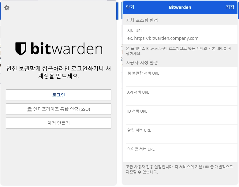 이제 비트워든 앱이나 확장프로그램에서 로그인하기 전에 설정 버튼을 눌러서 서버 URL을 자신의 비트워든 주소로 설정한 뒤 로그인하면 된다.