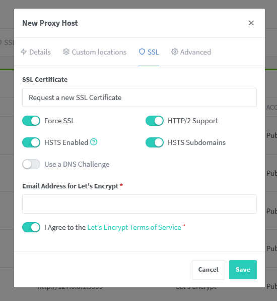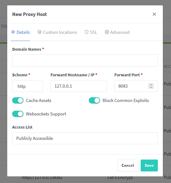 9. 지난번에 Nginx Proxy Manager를 설치했으니 얘로 HTTPS 리버스 프록시를 만들어보자. NPM에 접속해서 새로운 프록시 호스트를 만든다. 나는 NPM을 설치할 때 host 네트워크를 사용하도록 만들었기 때문에 그냥 주소에 루프백 아이피를 넣어줬지만, bridge 네트워크를 사용하도록 설치했다면 내부 아이피 주소를 넣어줘야 할 것이다.