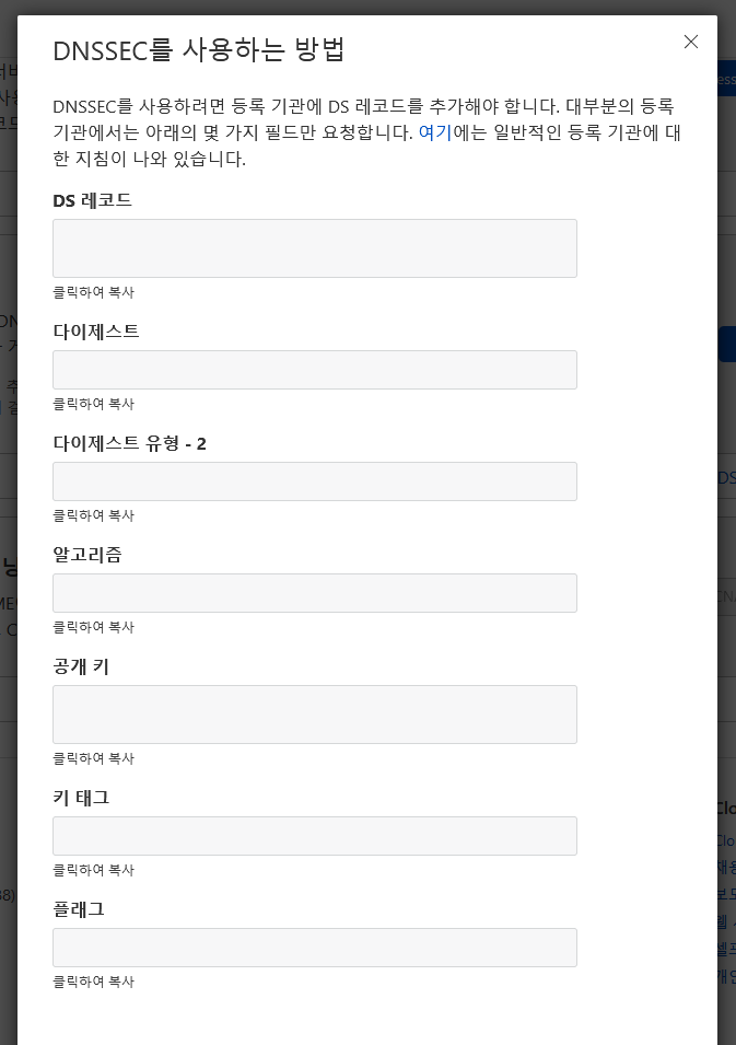 클라우드플레어에서 DNSSEC 사용 버튼을 누르면 이렇게 등록해야 하는 정보가 뜨는데