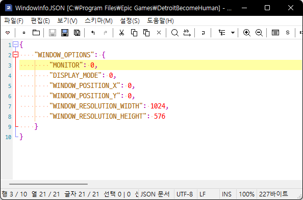 디트로이트 비컴 휴먼 설치 폴더로 이동한 뒤 "WindowInfo.JSON"이란 파일을 찾아서 메모장으로 연다. 나는 에픽 게임즈에서 구매해서 설치 경로가 "C:\Program Files\Epic Games\DetroitBecomeHuman"이다.