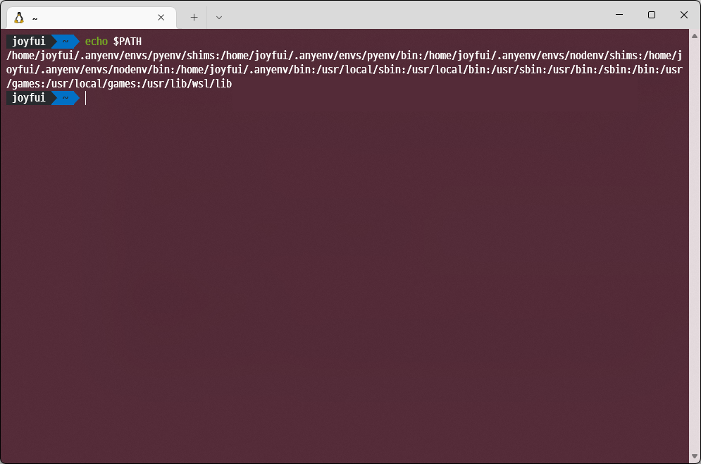 이제 wsl을 닫고 윈도우에서 wsl --shutdown 명령어로 wsl을 완전히 종료한 다음에 다시 wsl을 키면 이제 윈도우 환경변수가 추가되지 않는 모습을 볼 수 있다.
