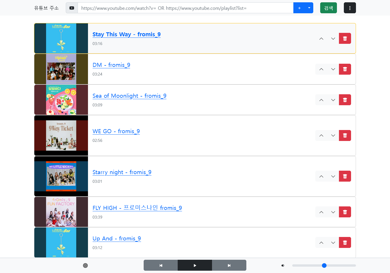 최근에 플레이리스트 추가 기능을 추가하면서 중요한 꿀팁 소개. https://www.youtube.com/watch?v=\${videoId}&list=RDAMVM\${videoId} 꼴의 URL은 유튜브에서 자동으로 생성해주는 해당 videoId의 믹스 재생 목록이다. 이걸로 비슷한 여러 곡을 한꺼번에 추가할 수 있다. 단, 재생 목록의 영상의 200여 개나 되므로 추가하는 데 오래 걸림