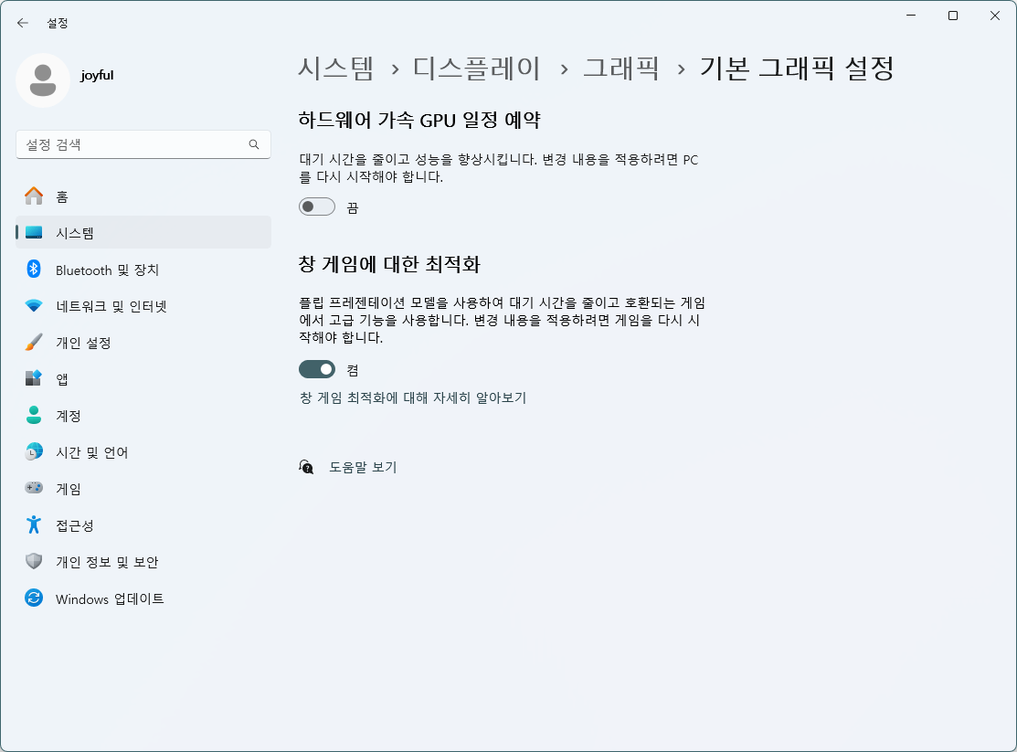 근데 이거 포맷 전에도 활성화해 놨을 텐데?? 게임 성능에 좋다길래 예전부터 켜두던(아마 기본값도 켜둠이었던 걸로…) 설정인데 이번에 끄니까 해결되었다. 성능 차이도 딱히 느껴지진 않는다.
