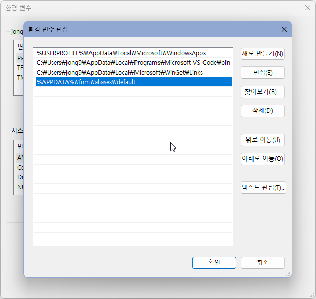 여기에 “%APPDATA%\fnm\aliases\default” 경로를 추가해 준다.