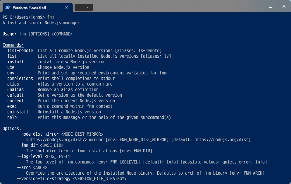 설치하고 나면 이렇게 fnm 명령어를 사용할 수 있게 된다.