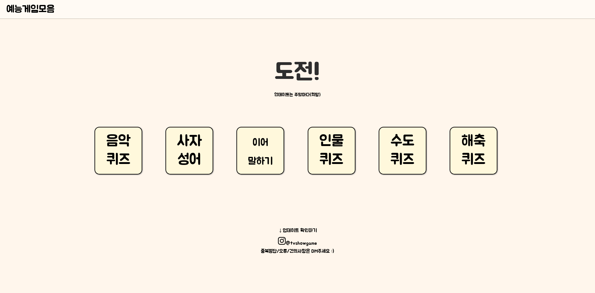 신서유기 등 예능 방송에 나온 게임을 직접 할 수 있는 사이트이다. 예전에 침착맨 방송에 나와서 유명해진 사이트인데 심심할 때 하면 좋다.