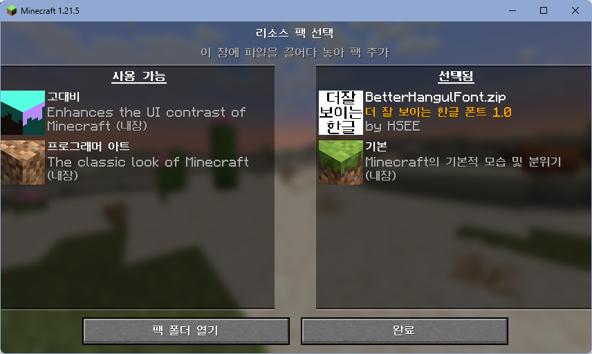 마크를 켜고 설정 → 리소스 팩 → 팩 폴더 열기를 누르면 디렉토리가 하나 열린다. 여기에 위에서 다운받은 BetterHangulFont.zip 파일을 넣으면 리소스 팩이 목록에 보이는데 오른쪽으로 보내면 적용 끝!
