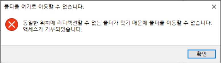 탐색기로 사용자 폴더에 들어가서 바탕화면, 문서, 사진의 속성에 들어가면 위치 탭에서 경로를 수정할 수 있는데 이를 원래 위치로 변경하려고 하면 아래 메시지가 뜨며 변경도 안 된다.