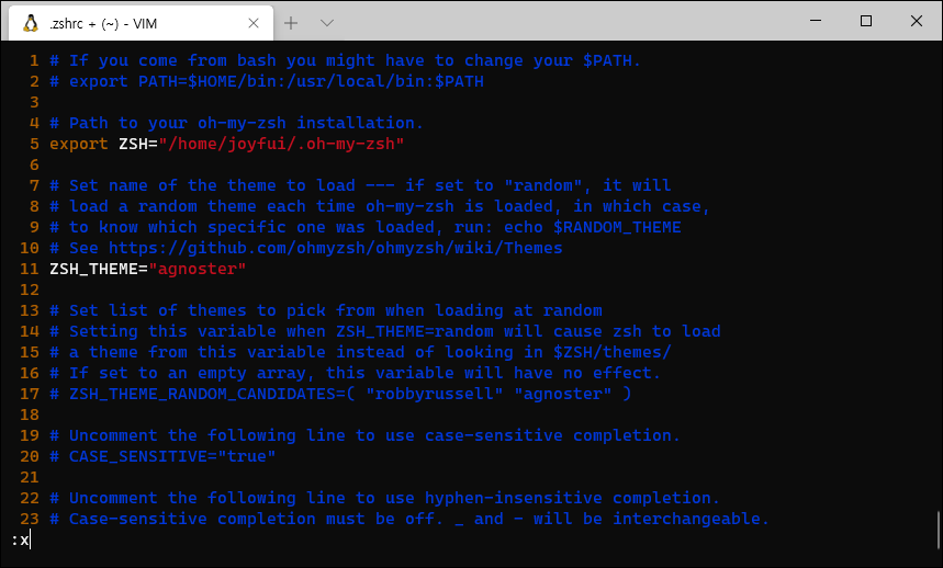 .zshrc 파일을 열고 ZSH_THEME="robbyrussell" 부분을 ZSH_THEME="agnoster"로 바꿔준다.