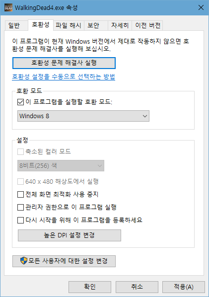 워킹데드 설치 폴더로 이동한 뒤 실행파일(WalkingDead4.exe)의 속성에 들어가서 호환 모드를 Windows 8로 설정하면 된다.