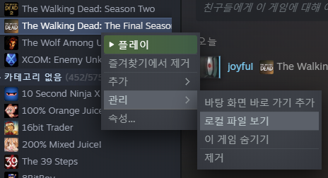 워킹데드 설치 폴더는 스팀에서 설치했다면 아래 이미지처럼 쉽게 찾을 수 있다.